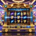 Mesin slot berwarna cerah dengan buah-buahan dan permen yang berputar di layar, dikelilingi oleh lampu dan latar belakang berwarna pastel yang ceria.
